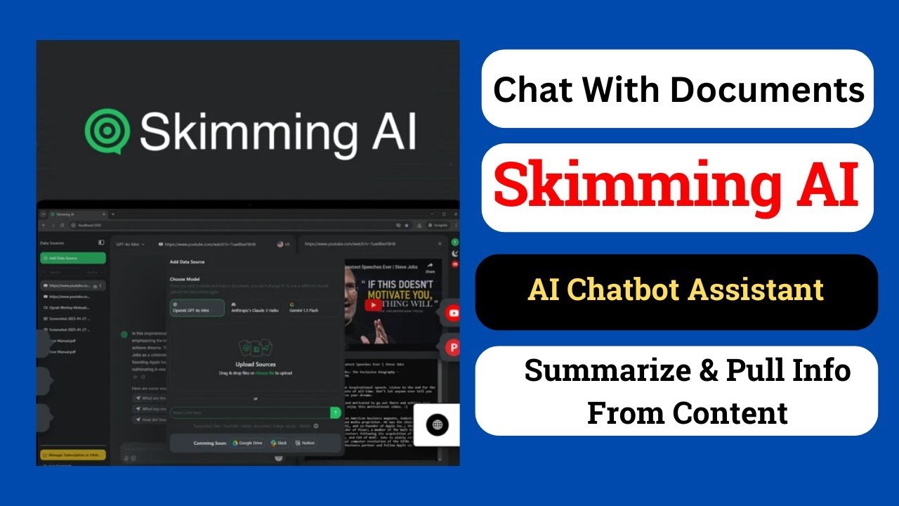 Skimming AI feels like an always-on research assistant I can talk to. Instead of reading a long PDF or rewatching a 45-minute video, I upload or link the source and ask questions. It works as an AI document summarizer, a YouTube summary tool, and a quick way to pull key points from audio, images, and websites.